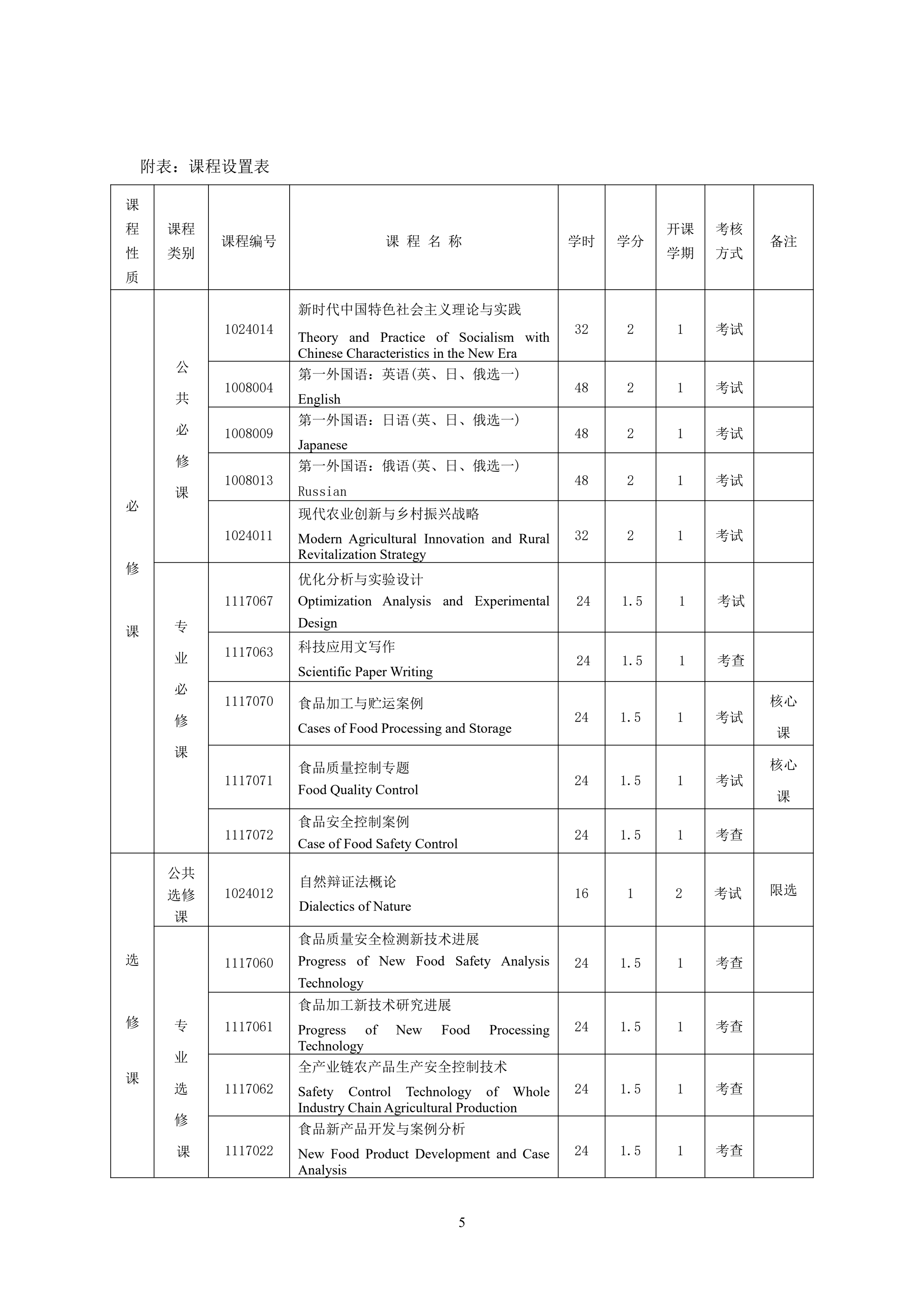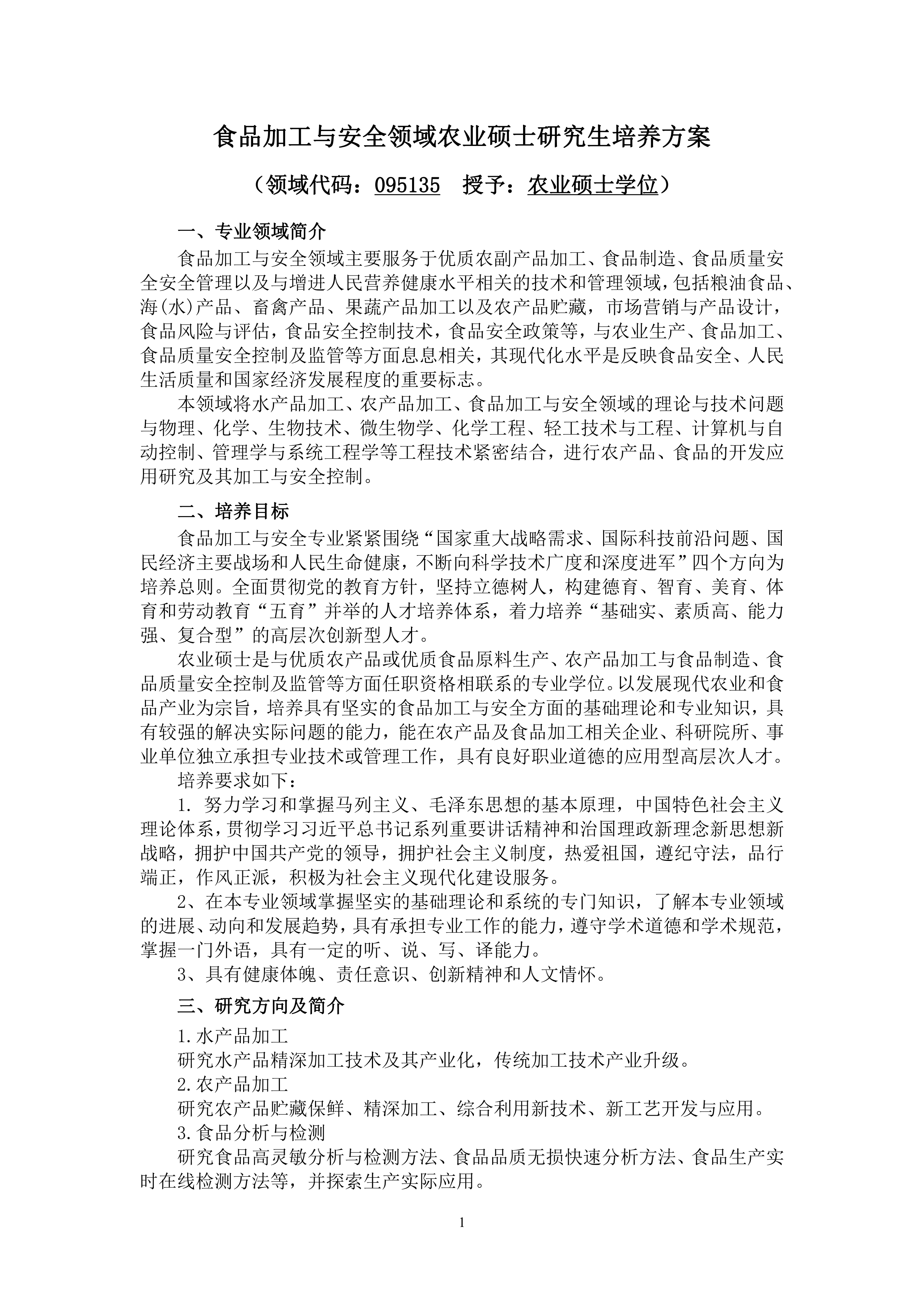2022年食品加工与安全领域农业硕士研究生培养方案