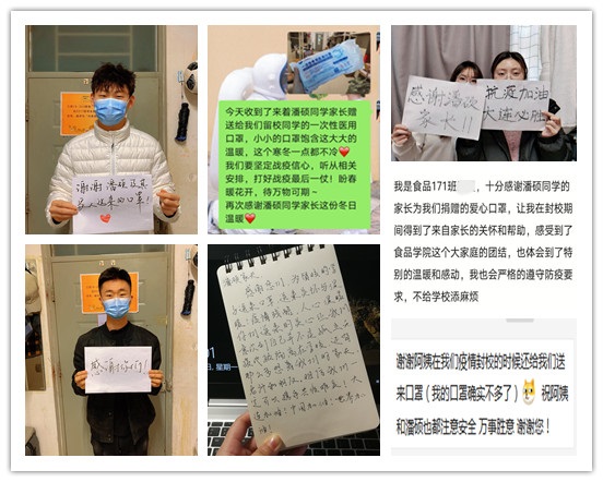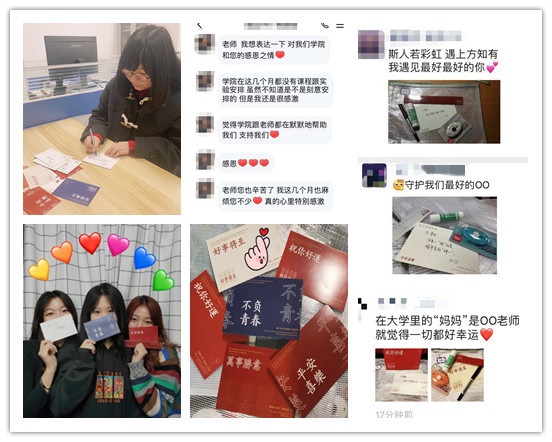 除此之外,辅导员谷媛媛老师为每个留校学生手写了“加油贺卡”,鼓励同学们珍惜时光,坚定信心。充满暖意和爱心的“医用口罩”和“爱心贺卡”,凝聚着家长和老师无限的关怀和鼓励,也传递了学校和学院的温暖和牵挂。同学们通过多种形式纷纷表达了感激之情,更增强了战胜疫情的信心。