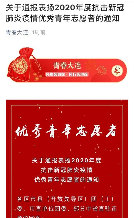 大连市2020年度抗击新冠肺炎疫情优秀青年志愿者评选结果公布