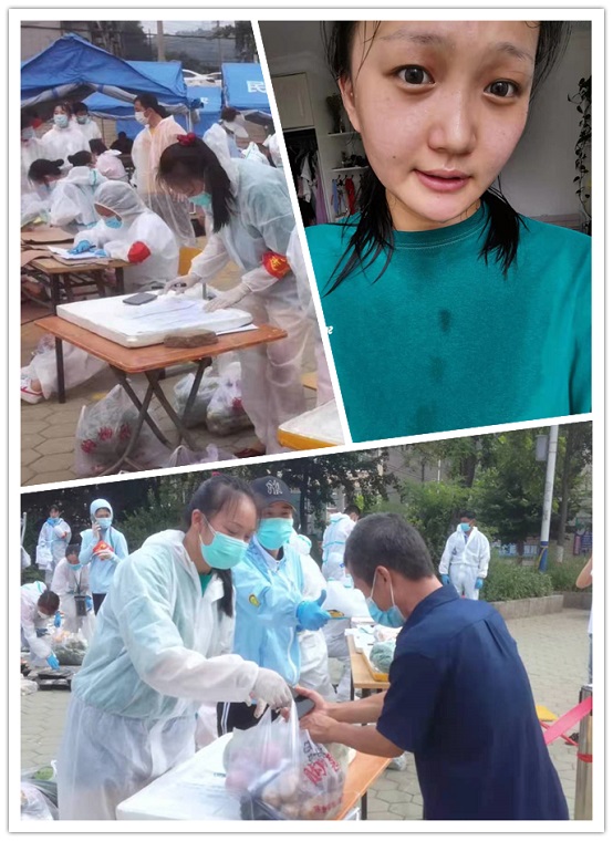 “7·22”大连市疫情发生后,梁爽同学积极投身抗“疫”一线,主动申请成为一名疫情防控志愿者,加入甘井子区大连湾街道北山社区志愿服务队,协助开展相关防疫防控工作。梁爽同学家住大连湾街道北山社区元宝山小区,与凯洋食品有限公司相距不到两百米。小区封闭后,梁爽妈妈隔离在单位,家里只剩下她和妹妹、姥姥。当得知社区招募志愿者,她明知会有危险,却义无反顾,第一时间主动报名参加。酷暑下,她穿着密不透风的防护服,成为社区家园的守护者“大白”,与医护人员一起奋斗在一线,先后参加了三次核酸检测志愿服务工作,耐心维护现场秩序,认真登记检测人员信息。汗水湿透了全身,她克服闷热造成的眩晕,从早上7点一直工作到近午夜零点,浑身起的热痱子让她夜不能寐,第二天她坚定地继续参加抗“疫”服务。核酸检测结束后,她又参加了为小区居民订购的东西按订单打包、配送生活物资及医疗物资等工作,并专门负责15号楼居民的生活问题。她风雨无阻,推着小推车及时配送,保障了居民每天都可以吃到新鲜的食品。一对姐弟的父母被隔离在外,家里没有生活物资,她一趟一趟地把物品从卡口送到楼上交给他们,鼓励姐弟俩安心在家。她特别关注家人隔离在外的老人和孩子们,尽可能按照他们的需要提供帮助,一位爷爷因为她的帮助备受感动而热泪盈眶。