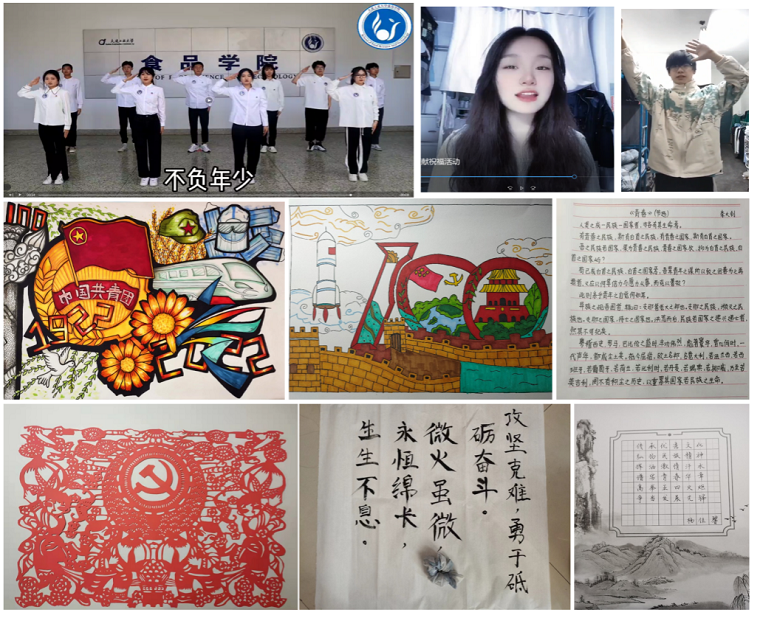 在中国共产主义青年团成立100周年之际,学院充分结合工科学生特点,用富有新时代传媒特色和青年学生喜闻乐见的方式,开展了“我为团团献祝福”文艺作品征集活动。广大学生以书法、绘画、短视频、舞蹈、剪纸、诗歌等方式传情,诉说对共青团的热爱与祝福,以此向建团百年献礼,许下食院青年同心向党的豪情誓言,营造了阳光向上的青春氛围。