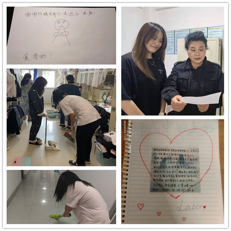 为保障校园生活的正常运转,学校多个部门的教职工长时间住校值班,24小时在岗,以校为家,用爱守护。学生看在眼里,记在心里,手写了感谢贺卡,送给辛苦付出的住校教职工,为他们在抗击疫情期间所做的大量工作和筑起的健康屏障表达了感恩之情。为引导广大学生在生活劳动中涵养劳动精神,共建安全卫生的校园环境,学院于五一期间开展争先创优宿舍大清扫活动。在校学生对宿舍及走廊楼道进行了清扫,打造了温馨健康的“小家”。