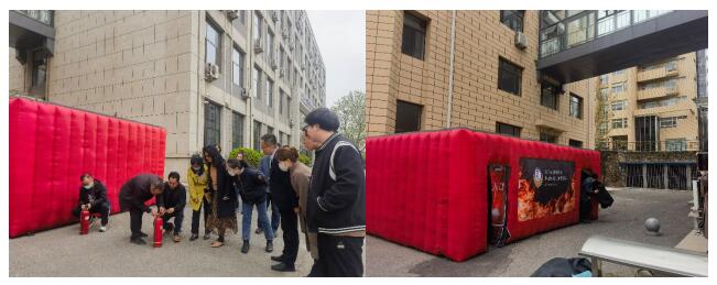 培训会后,培训专家在室外为师生演示了灭火器的使用方法,并模拟了火灾应急逃生情景。演练过程中,师生们牢记“上风方向喷射、提灭火器、拔保险、压手柄、对准火源根部”的原则,积极广泛地参与了演练。