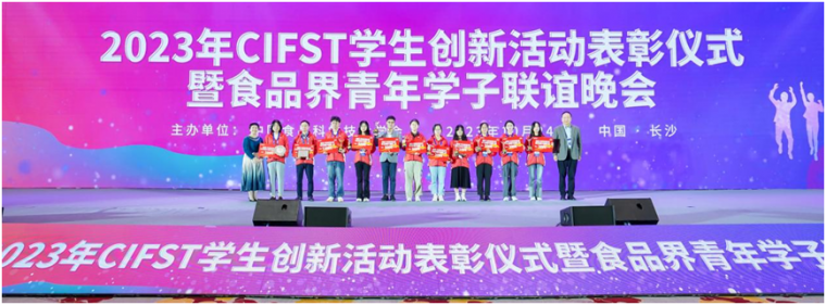 年会同期举行了2023年度李锦记杯学生创新大赛总决赛,由教师来斌指导的“醋香不减,美味无 ′咸′——煽动味蕾的减盐低糖油醋汁”荣获2023年度“李锦记杯”学生创新大赛三等奖,由教师阴法文指导的“当时蔬遇见虾——多风味虾酱粉”获得优秀奖。食品213班李萍等同学作为获奖团队学生代表同中国农业大学、上海海洋大学等10余所高校的获奖团队学生一同参加了2023年CIFST学生创新活动表彰仪式。