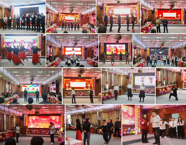 联欢会上,反差感搞笑舞蹈《爱你》《改革春风吹满地》,诗朗诵《我爱上班》,相声《科目三》由当下的流行热点改编而成,充分展现了学院教师的灵动活力,笑果满满;舞蹈《美丽中国》和乐器演奏《赛马》热烈奔放,荡气回肠,用优美舞姿和磅礴旋律诉说着对祖国大好河山的深沉热爱和真挚祝福;歌曲小合唱《少年》《这世界那么多人》《当》《恭喜发财》歌声婉转悠扬,唤醒了现场观众对青春的美好回忆,传递了温情力量;双节棍表演《仙剑奇缘》展现了中华武术文化的精髓和魅力。在互动游戏“识字传声”“你画我猜”中,教师踊跃参与,妙语连珠,精彩纷呈,现场掌声、笑声、欢呼声此起彼伏。最后,在学院领导班子成员领唱、全院教师合唱的《相亲相爱一家人》歌曲其乐融融的氛围里,联欢会落下帷幕。
