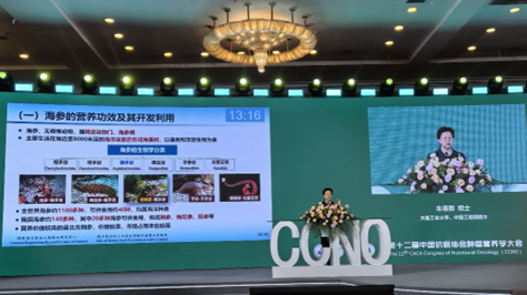 朱蓓薇院士在开幕式上致辞,她阐述了海洋食品在营养健康领域的巨大潜力,希望加强营养与肿瘤治疗的交叉研究,揭示营养与肿瘤发生、发展的内在关系,为肿瘤的预防和治疗提供新的视角和方法,为临床提供更多科学、有效的营养治疗方案。大会期间,朱院士受邀作题为《海洋食品的营养及功能因子作用的探讨》的大会报告。报告围绕海洋食品对人类健康作用、海洋功能因子的开发现状等方面进行了深入阐述,指出海洋食品肩负着提高人类健康的使命,并分享了海参、牡蛎等海洋食品的营养功效及其开发利用。报告引起与会者的广泛关注,为推进海洋食品营养与功能因子在肿瘤等疾病预防和治疗中的应用,以及食品领域的创新发展提供了新的思路和途径。