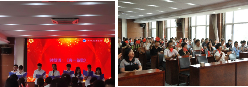 在党日活动上,由学院8名教师及学生党员演出诗朗诵《有一首歌》,用红色经典诗文回顾了党的光荣历史,歌颂党的丰功伟绩,抒发永远跟党走的坚定信念。在诗朗诵的最后,随着音乐的响起,全体党员共同唱响了《没有共产党就没有新中国》。