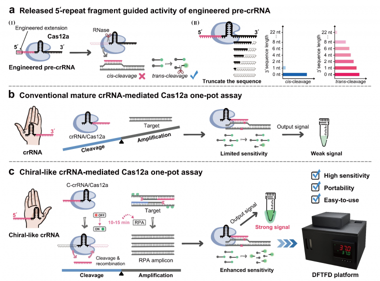 研究发现,工程化的5'端重复片段能够有效激活Cas12a的切割活性,其切割效率强烈依赖于3'端间隔区的序列长度。值得注意的是,当3'端间隔区完全截短时,会形成一种“类手性crRNA”构象,从而引导出一种延迟切换模式的Cas12a激活机制,这与传统的成熟crRNA截然不同。基于这一特性,该团队开发了一种基于延迟切割特征的一锅法传感策略,以应对长期以来基于Cas12a的切割反应与核酸扩增不相容的难题,其灵敏度相较于传统的成熟crRNA介导的一锅法提升了1,000倍。此外,将基于切割的一锅法检测与便携式温控荧光成像设备整合,构建了一个用于高通量筛查的现场诊断平台,实现了海产品中多种致病菌的准确快速检测。该研究进一步深化了对crRNA引导机制的理解,并推动了其在基因编辑和分子诊断领域应用范围的拓展。