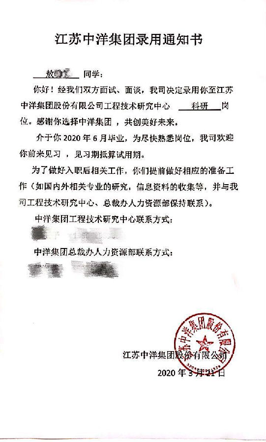 敖晓林等6名毕业研究生收到江苏中洋集团录用通知书