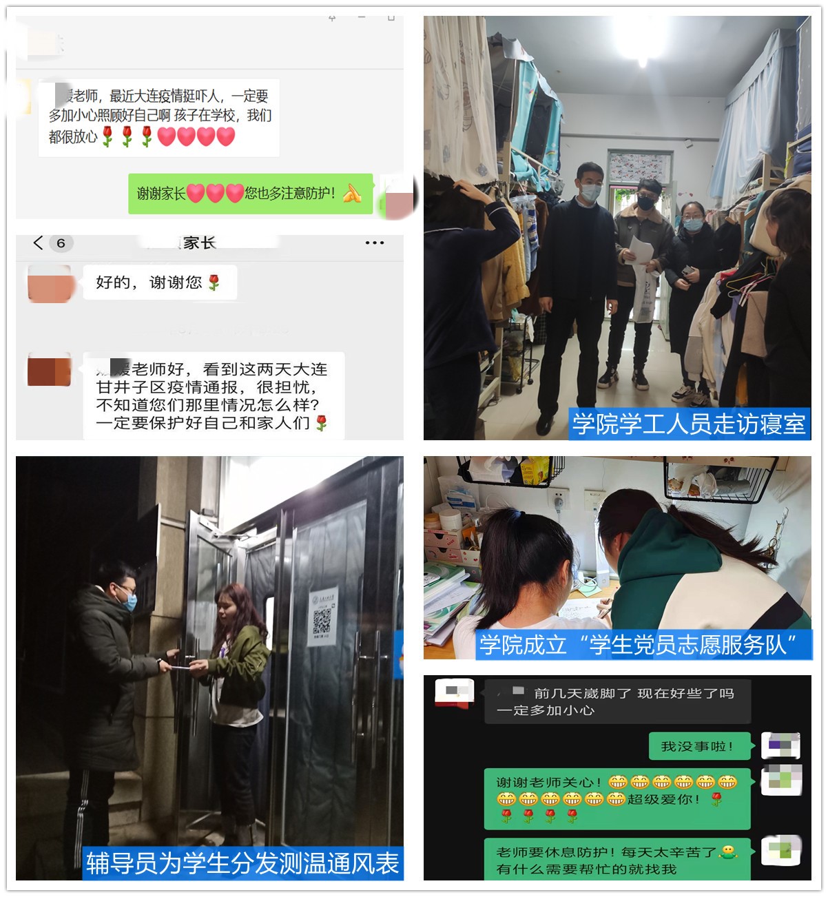 学院严格落实教育系统疫情防控40条规定,确保教职工“十必须”,学生“六做到”,校园防控“二十到位”,全体学生完成大连市要求的两轮全员核酸检测且结果均为“阴性”。同时,根据重点管控、关注地区的变化动态排查,不留死角。学生进行每天三次测温和宿舍通风,施行学生-寝室长-辅导员-学院的四级联动日报制度,强化学生戴口罩、勤洗手的防疫意识,确保学生度过安全健康的封校管理生活。