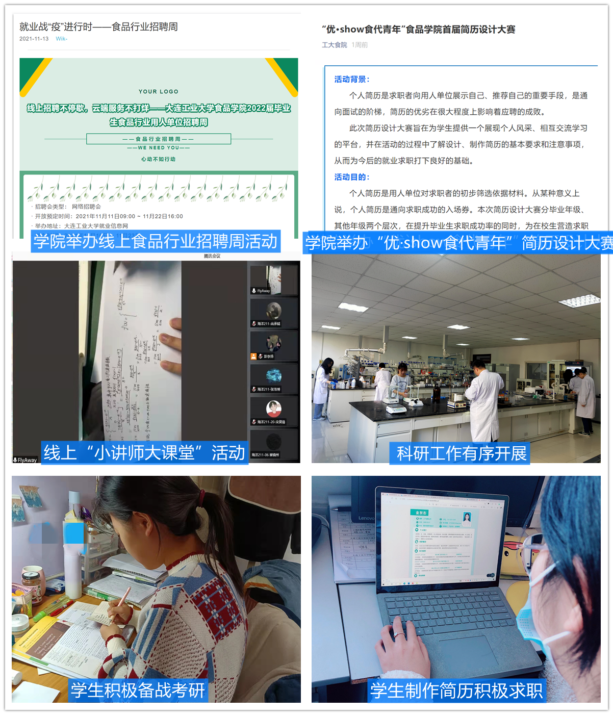 线上课堂中,学生积极通过实时弹幕文字进行反馈,与任课教师热烈互动,课堂学习氛围浓厚。学生在课下自发组织线上“小讲师大课堂”、高数测验、英语早读、宿舍研讨等,不断巩固课堂学习内容。考研学生规律学习,每天早出晚归为梦想执着拼搏。针对毕业年级学生,学院举办简历设计大赛,并特别邀请专业对口企业举办食品行业用人单位线上招聘周活动,为学生的求职就业搭建平台,学生们也积极制作投递简历,把握就业机会。