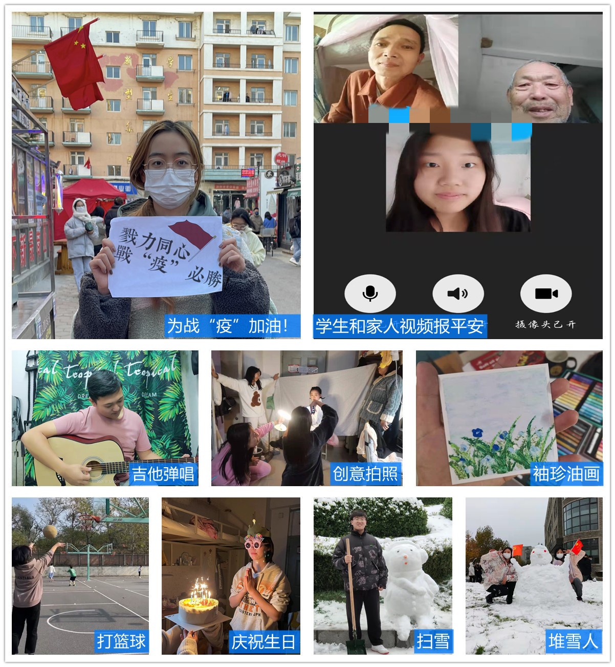 同学们以宿舍为家,积极开展了丰富多彩的课余文化活动,用自己的实际行动为大连抗疫加油!坚定战胜疫情信心,争做新时代先锋青年。无论是吉他弹唱、袖珍油画、体育锻炼、创意拍照,还是志愿扫雪等等,充分展现了当代大学生积极向上的精神风貌、劳动精神以及打赢这场疫情之战的坚强决心。