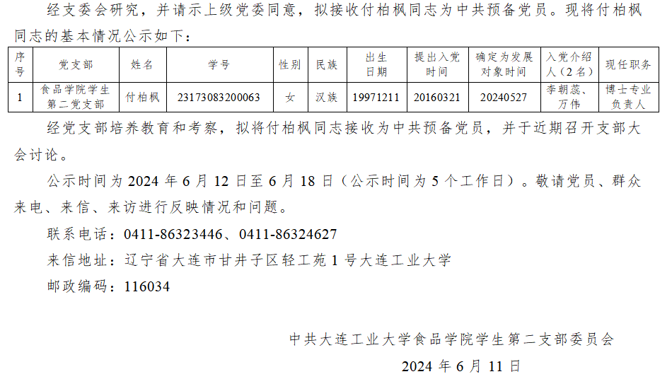 关于拟接付柏枫同志为预备党员的公示
