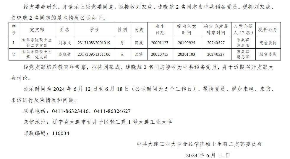 关于拟接收刘家成、迮晓航2名同志为预备党员的公示