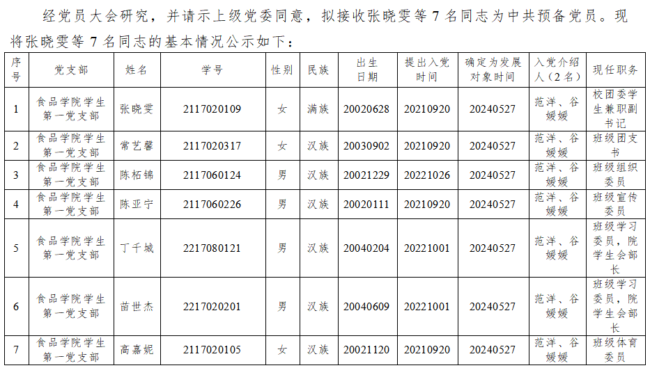 关于拟接收张晓雯等7名同志为预备党员的公示