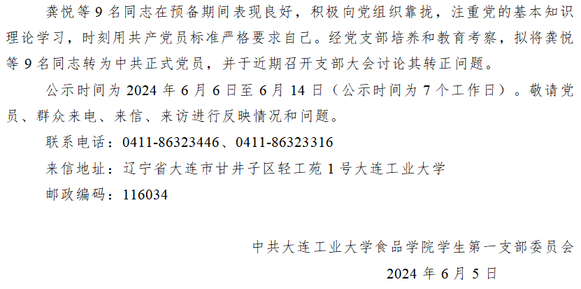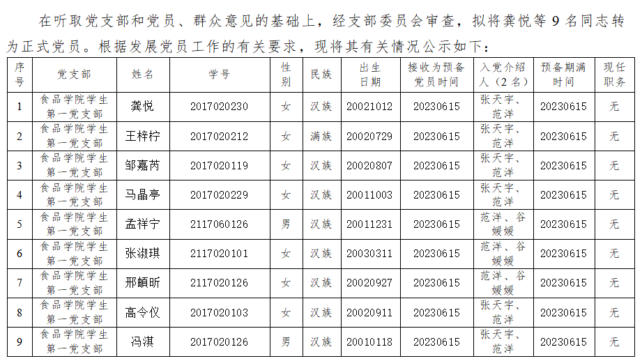 关于拟将龚悦等9名同志转为中共正式党员的公示