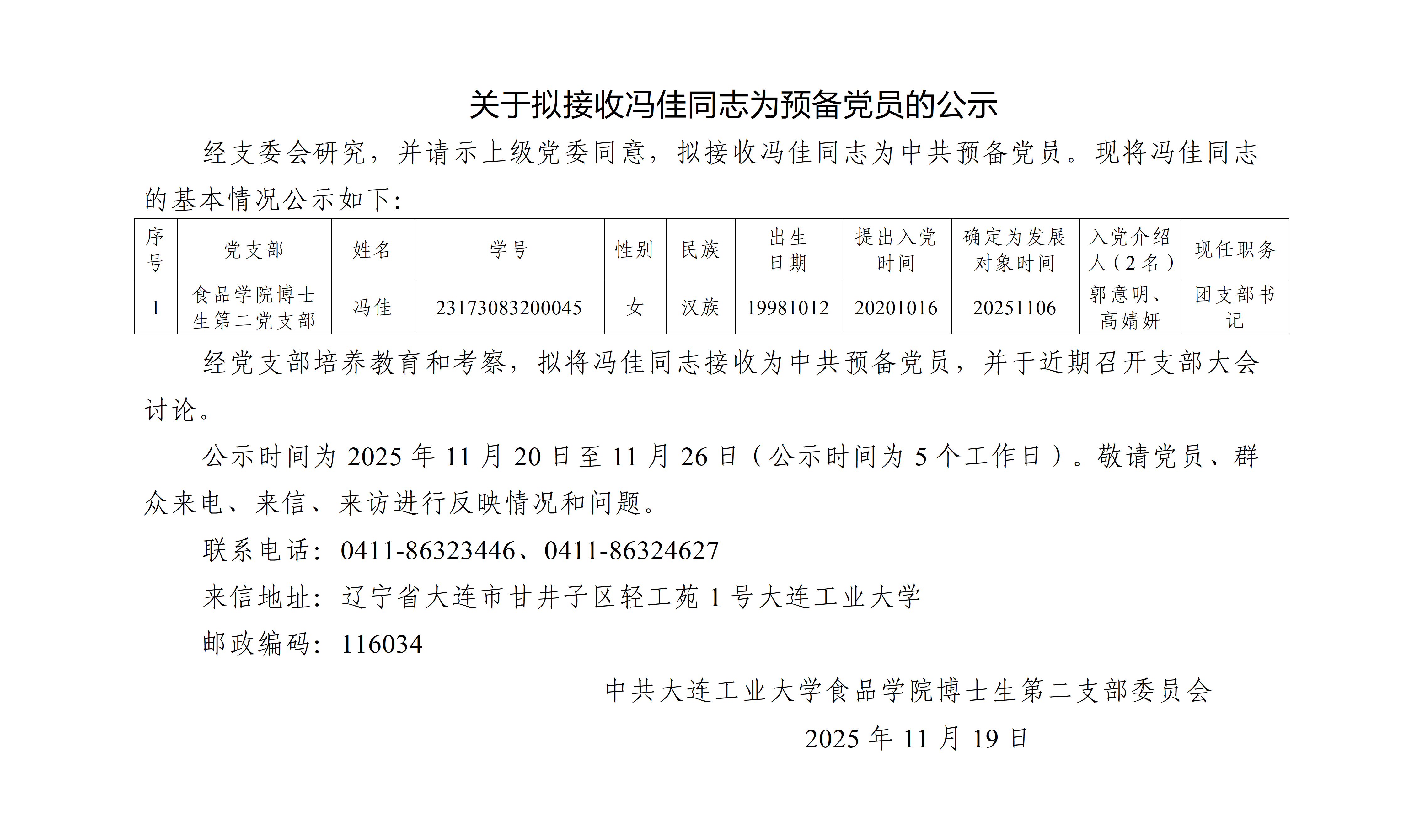 关于拟接收冯佳同志为预备党员的公示