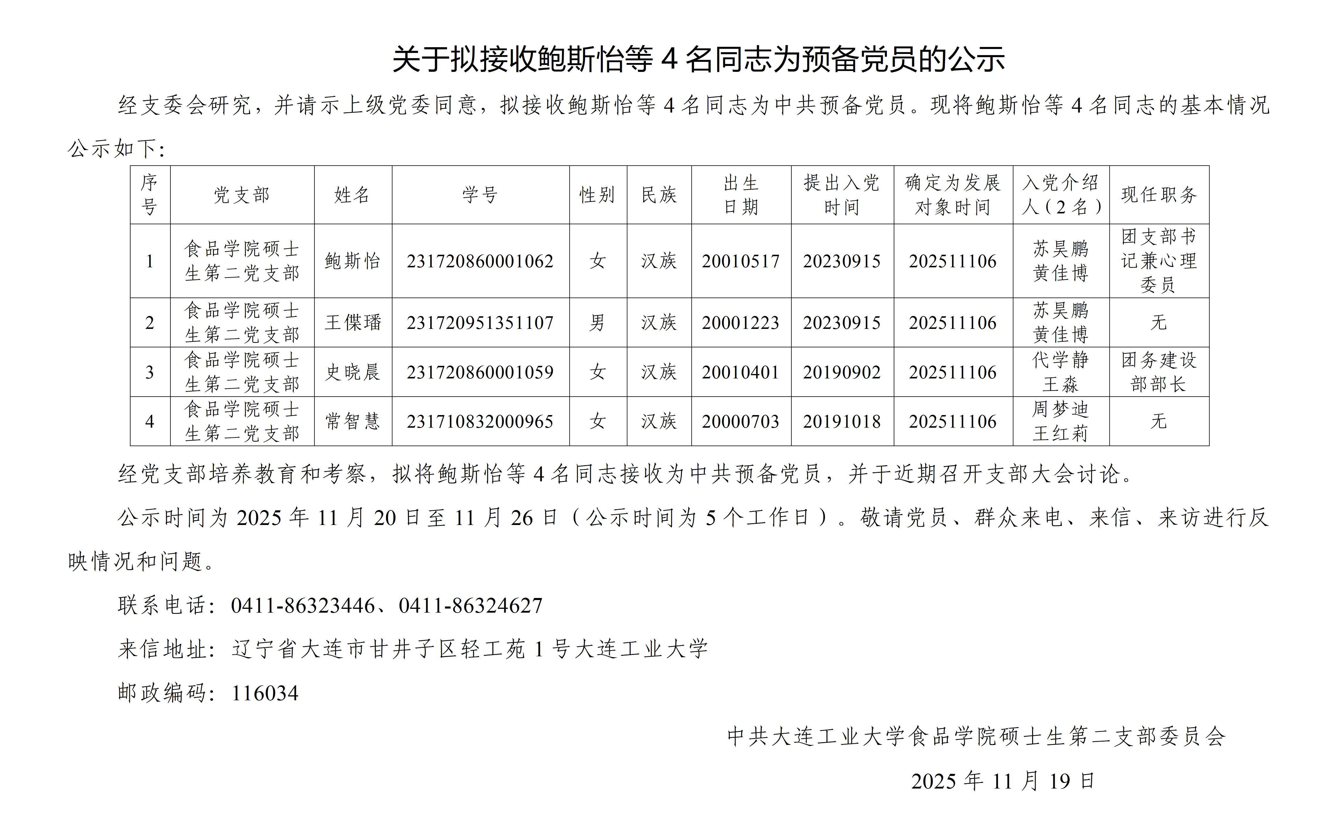关于拟接收鲍斯怡等4名同志为预备党员的公示
