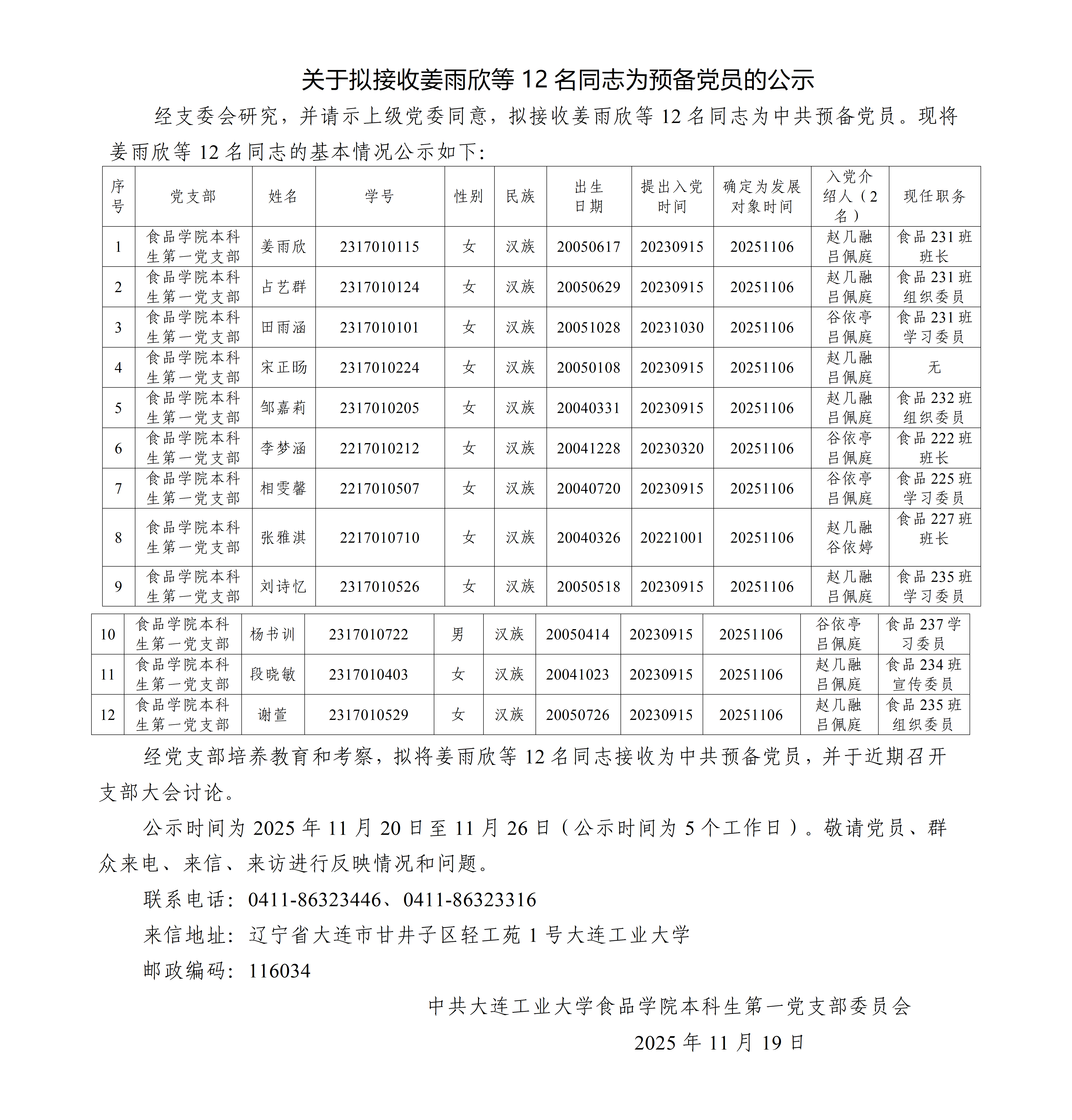 关干拟接收姜雨欣等12名同志为预备党员的公示