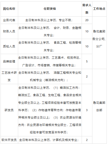 需求专业:市场营销、国际贸易、会计、会计电算化、财务管理、食品科学与工程、食品营养与检测、工艺美术、视觉传达、广告设计、市场营销、传媒、油脂工程、粮油机械、粮油加工、食品工程、生物工程、作物遗传育种、农业资源与环境、计算机等专业。
