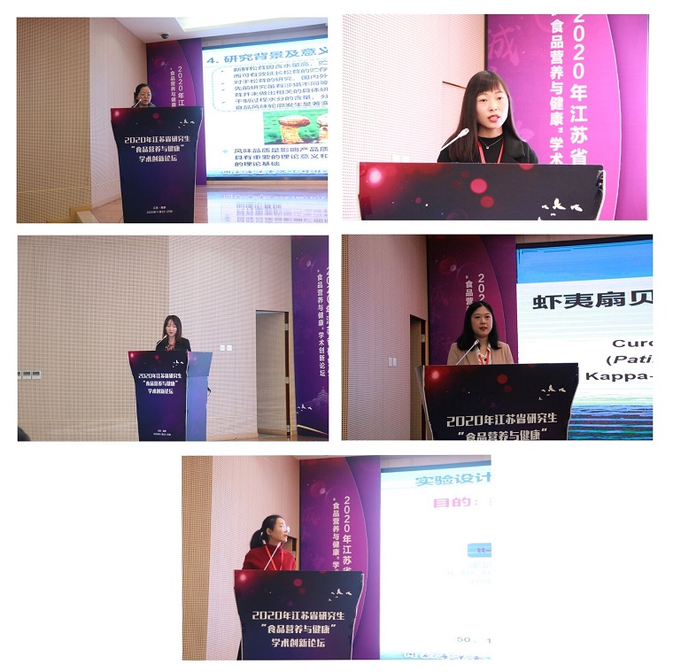 我校博士研究生李梦琪、徐玉、吴迪、阎佳楠和胡园园分别做了 “传统热风感知技术影响长白山野生松茸特征风味物质变化规律及其指纹图谱构建研究”、“Construction of ginsenoside nanoparticles with pH/reduction dual response for enhancement of their cytotoxicity toward HepG2 cells”、“Effects of conventional food processing modifications on physicochemical properties and simulated gastrointestinal digestibility of scallops (Chlamys farreri) protein”、“虾夷扇贝酶解物/卡拉胶凝胶化微胶囊包埋姜黄素的表征及递送研究”、“反,反-2, 4-癸二烯醛通过诱导氧化/氮化应激和细胞凋亡损害血管内皮功能”的报告。