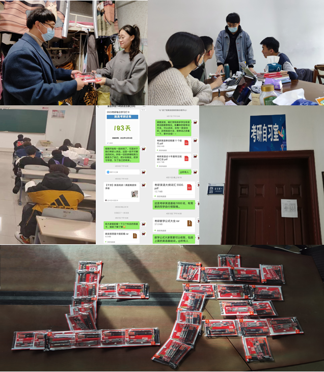 学院通过线上线下多渠道开展考研学生压力排解和心理疏导工作,帮助同学们了解如何在冲刺阶段有效缓解紧张情绪;创建“2023届考研学生群”,共享学习资料、报考注意事项和实时考研资讯。学院在食品楼专门设置了“考研自习室”,并为考研学子精心准备了考试备品。