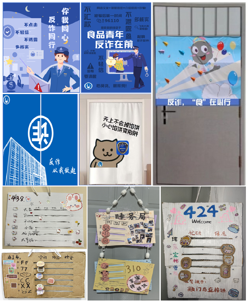 一扇门可以成为一个故事,承载一段回忆。同学们结合反诈防骗、专业特色元素设计了寝室门帘和创意门牌。活动中,同学们回顾总结相关案例,对电信诈骗有了更加深刻的认识,同时也起到教育警示作用,营造了浓厚的反诈氛围,增强了学生对寝室的认同感、归属感。